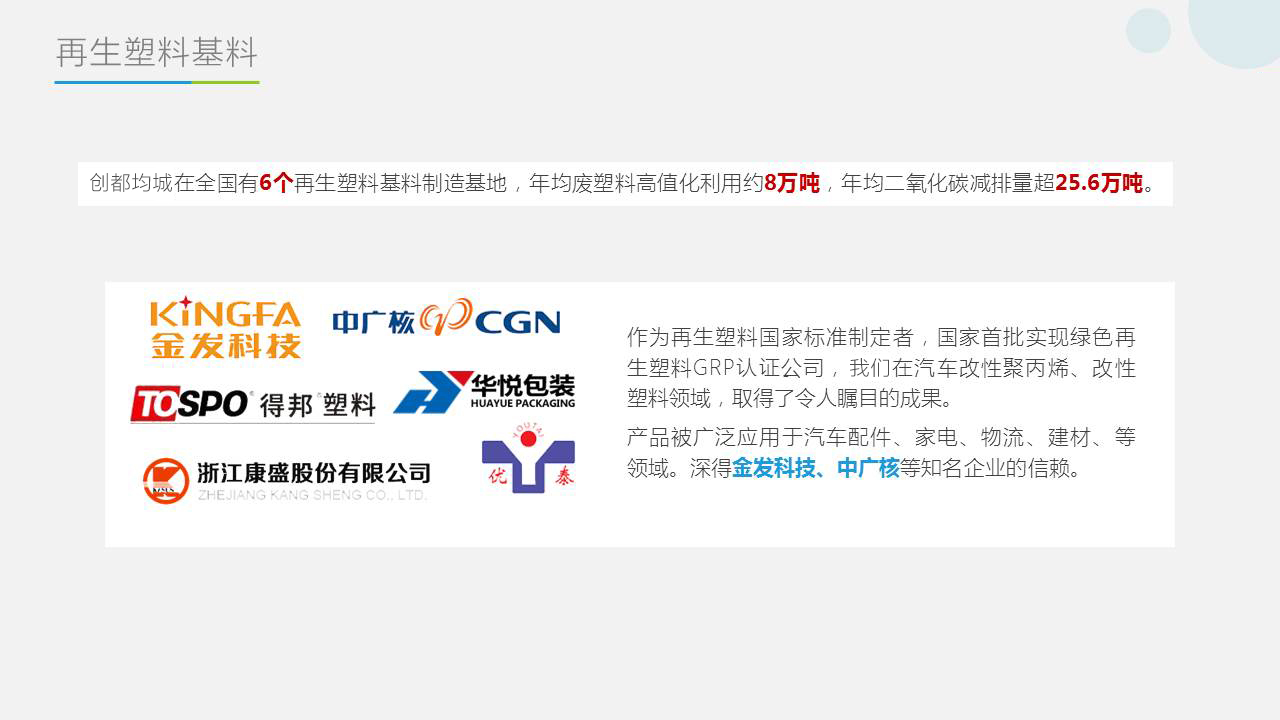 创都均城在全国有6个再生塑料基料制造基地,年均废塑料高值化利用约8万吨。